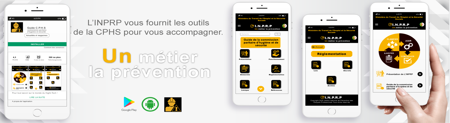 Leader dans son domaine, l'Institut National de la Prévention des Risques Professionnels (INPRP) est né pour améliorer les conditions d'hygiène et de sécurité de votre milieu de travail à travers des programmes d'expertise, de recherche, de développement et de formation. Sa mission principale est d'accompagner les artisans ainsi que les entreprises des secteurs privé et public dans leur processus de prévention des risques professionnels L'INPRP vous donne ainsi les clés et les outils pour réunir toutes les conditions optimales de travail en toute sécurité pour vous et vos salariés.
